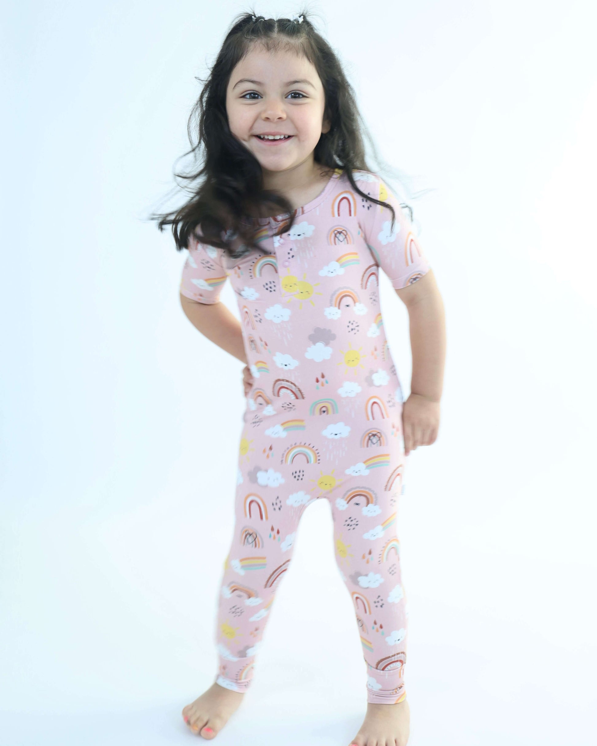 Let your little one shine bright in our Bamboo Pull Up Romper. This cheerful print is filled with playful rainbows, smiling suns and dreamy clouds that capture the joy of nature after a Rainn storm. Itās a design that inspires wonder and brings a touch of sunshine to everyday play, perfect for little adventurers who love both indoor snuggles and outdoor exploring.