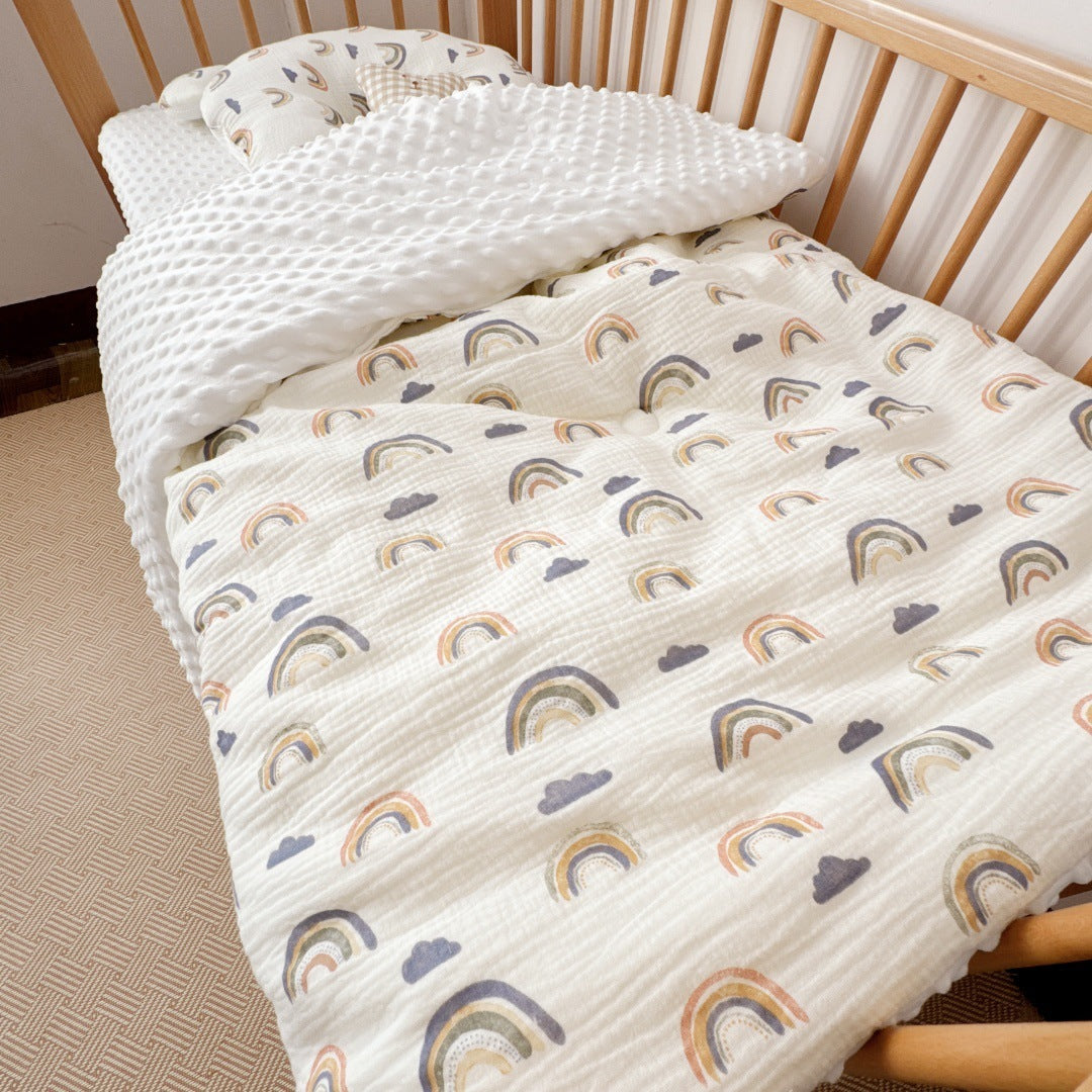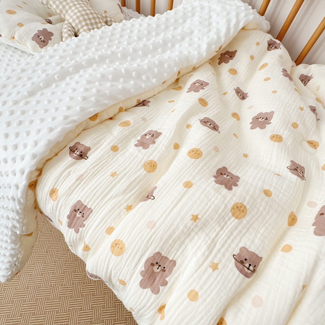 Available in charming patterns like Little Polka Dot Bear, Starry Bear, Cherry Blossom, and Blue Sky Rainbow, each design adds a playful yet soothing touch to any child’s room. With multiple options — from lightweight summer quilts to plush winter versions — there’s a perfect match for every bedtime routine.