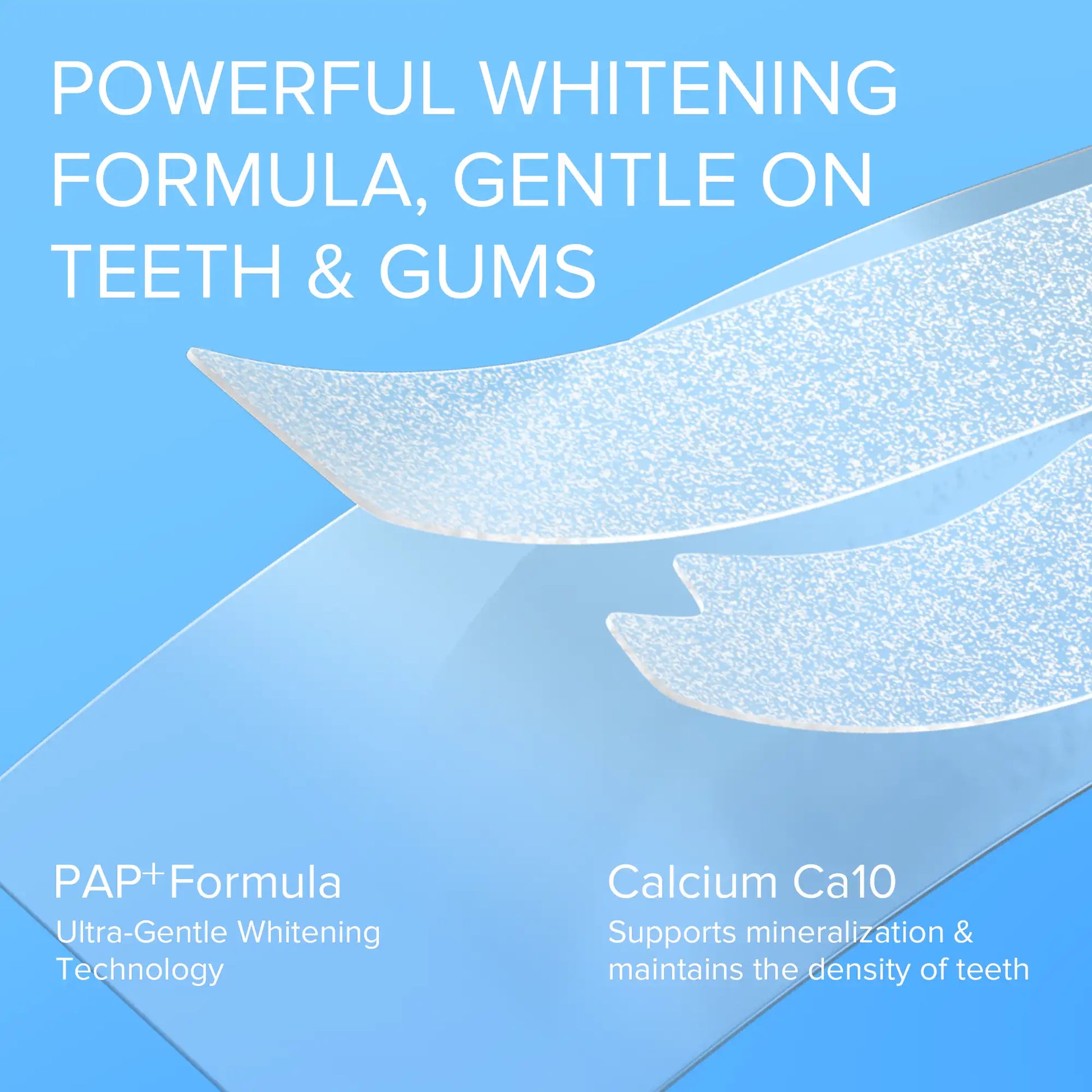 Effective & Safe Teeth with PAP Technology—Unlike traditional peroxide-based teeth whiteners, scientifically proven PAP tech whitens teeth without causing pain or increased sensitivity, providing a comfortable whitening with our strips.