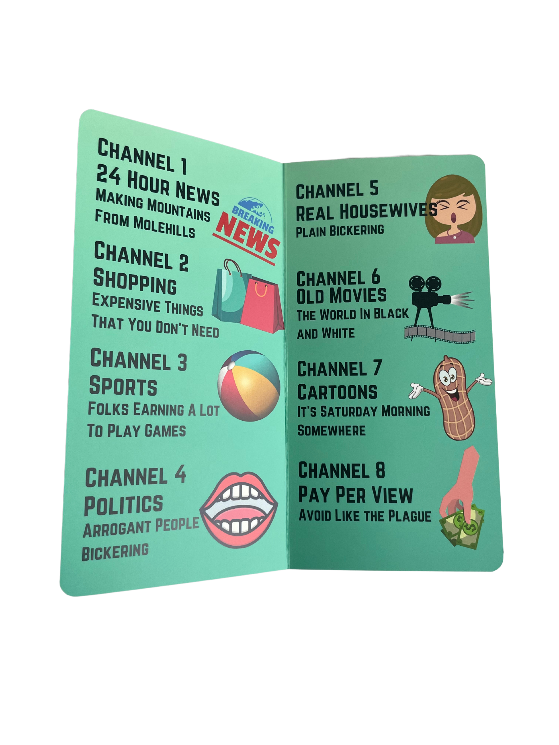 Included is a waterproof "Channel Guide" which describes the typical TV content in a way which will, hopefully, make you laugh.